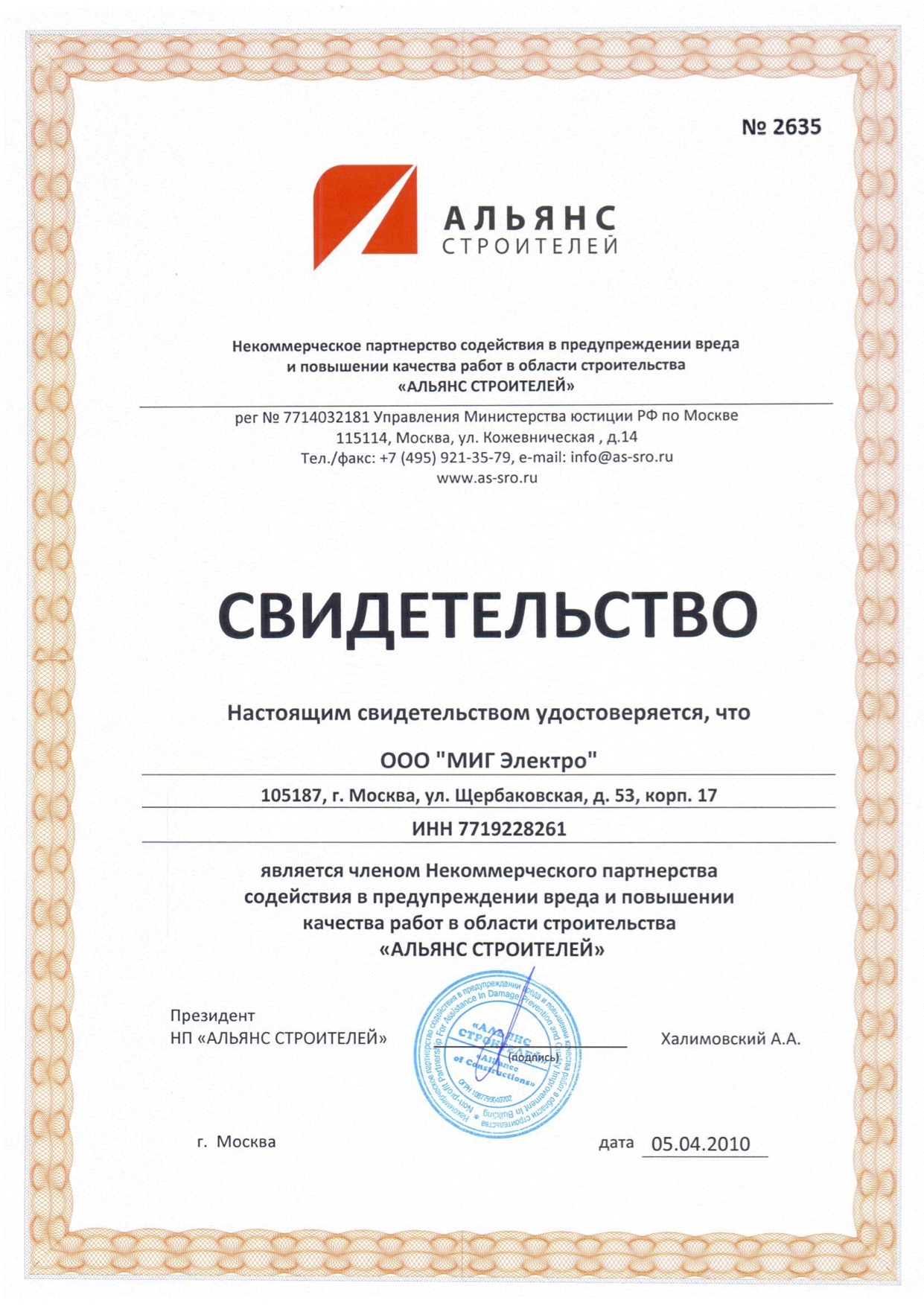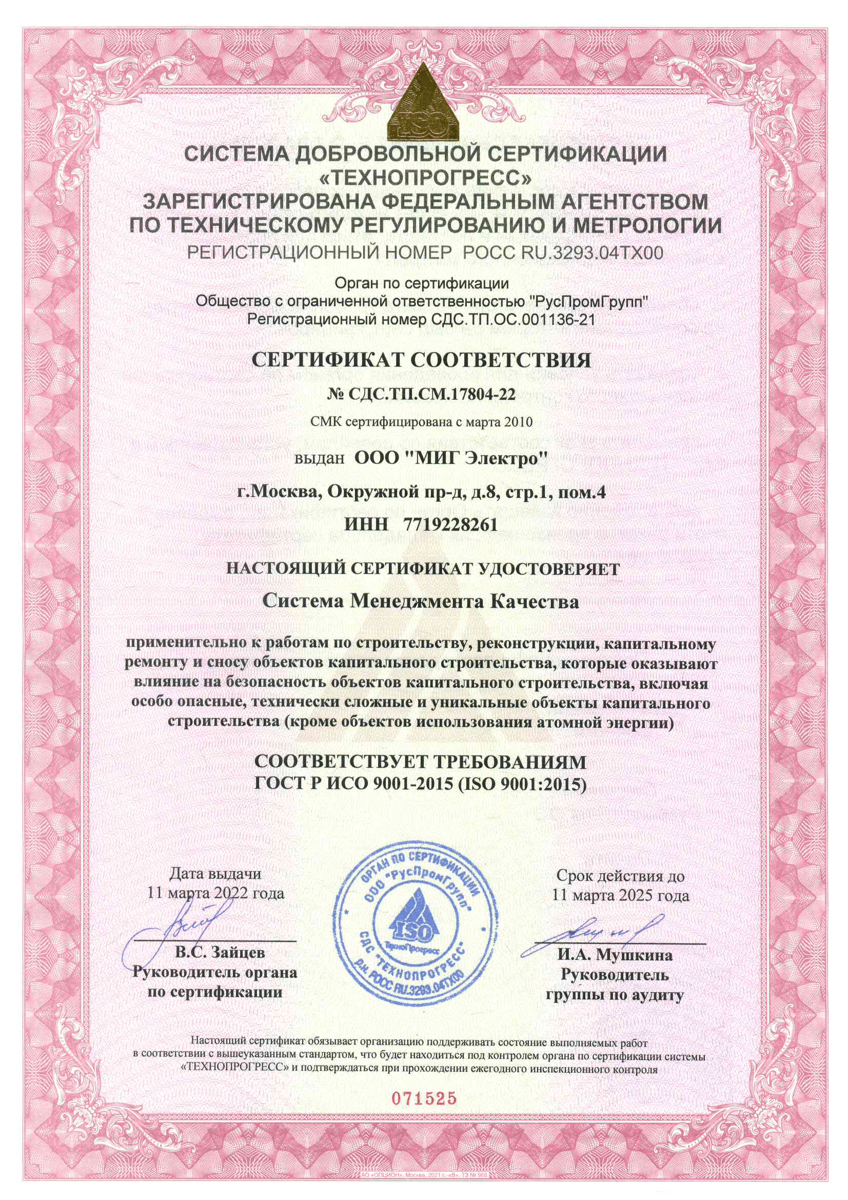 Сертификат соответствия Системы Менеджмента Качества ГОСТ Р ИСО 9001-2015 (ISO 9001:2015), применительно к работам по строительству, реконструкции и капитальному ремонту, которые оказывают влияние на безопасность объектов капитального строительства, включая особо опасные, технически сложные и уникальные объекты капитального строительства (кроме объектов использования атомной энергии). Устройство наружных электрических сетей и линий связи, монтажные работы, пусконаладочные работы.
