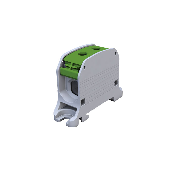 Проходные клеммы для подключения алюминиевых и медных проводников 95 кв мм 1-полюсная двойная. Подсоединение многожильных, одножильных, опрессованных многожильных проводов. Корпус серый, крышка зеленая. Ввод / выход 2 x 16-95 кв мм / 2 x 16-95 кв мм. Монтаж на DIN рейку или монтажную плату.