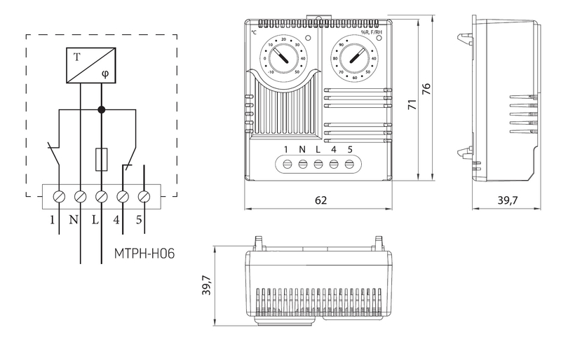 Комбинированное устройство гигростат-термостат, относительная влажность 40-90%, диапазон уставок 0+60С, переключающий контакт/реле, для вентиляторов и нагревателей