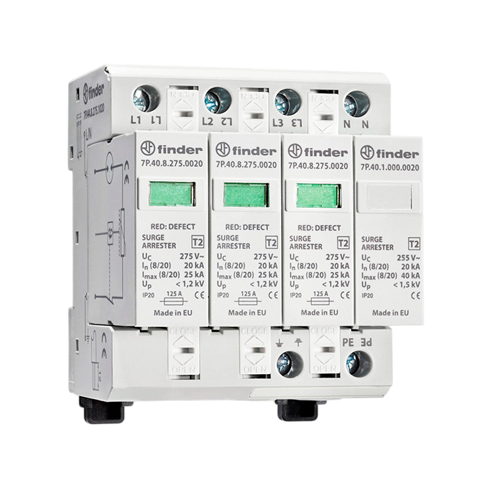 Устройство защиты от импульсных перенапряжений УЗИП тип 2 (3 варистора + 1 искровой разрядник); модульный, ширина 70мм; степень защиты IP20