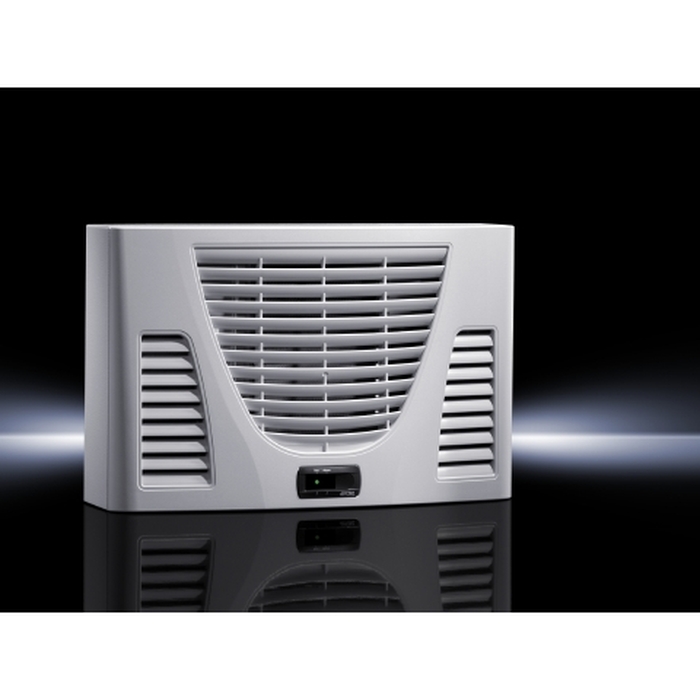 Кондиционер щитовой навесной (холодильный агрегат) фронтальный, металлическая лицевая панель, мощность охлаждения 300 Вт, номинальное напряжение 230 В (АС), IP54, RAL 7035. Монтаж на боковую стенку (дверь). Серия - MCF