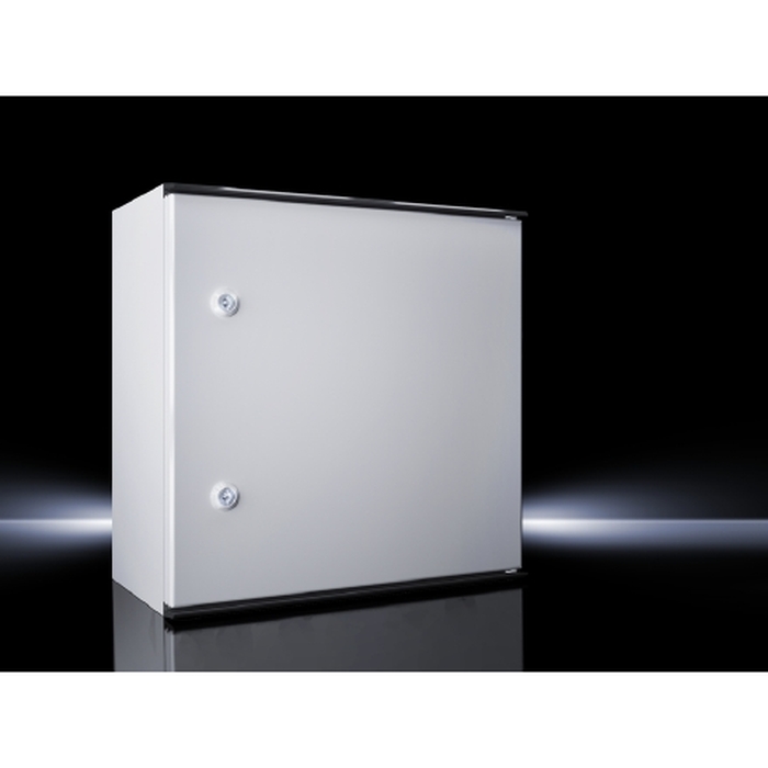 Корпус с дверью на шарнирах, полностью закрытый, замок под ключ с двойной бородкой 3 мм, Монтажная панель, Двойное уплотнение на верхней или нижней кромке двери в виде встроенного защитного козырька, По бокам инткгрированный C-образный профиль для плавной регулировки глубины монтажной панели Обзорное окно в двери