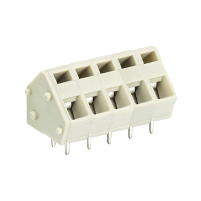 Клемма, подвод кабеля 45 град., на плату, шаг: 5.0 мм, 5 полюсов, фиксация провода пружинная, исполнение: без маркировки, 250V, 16A, цвет: серый