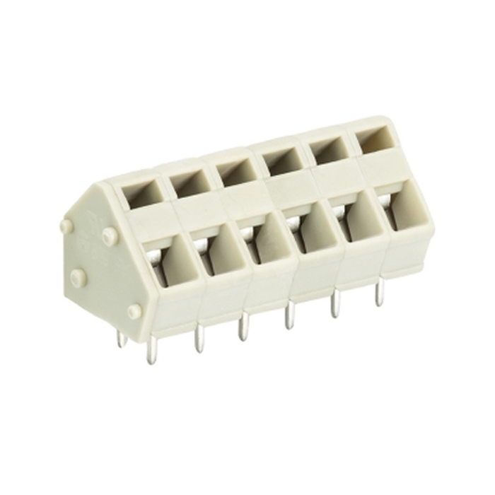 Клемма, подвод кабеля 45 град., на плату, шаг: 5.0 мм, 6 полюсов, фиксация провода пружинная, исполнение: без маркировки, 250V, 16A, цвет: серый
