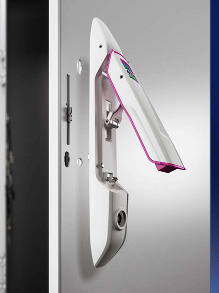 Комфортная ручка также монтируется полностью без инструментов и отличается гениальной складной конструкцией без зоны поворота и дополнительного необходимого пространства на двери. Комфортная ручка доступна во всех распространенных исполнениях и с замочными вкладышами.