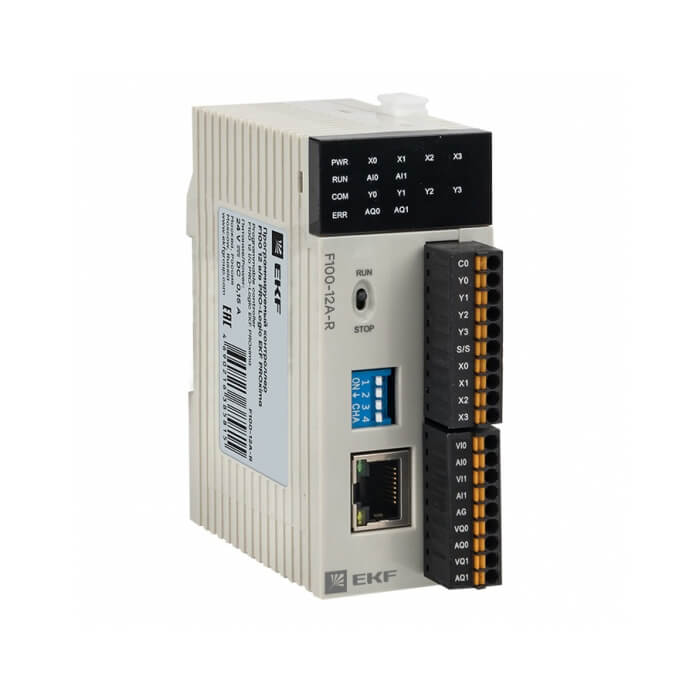 Программируемый логический контроллер F100. 4 дискретных входа (4DI), 4 дискретных выхода (4 NPN), 2 аналоговых входа 2AI), 2 аналоговых выхода (2 AO),напряжение питания 24B DC, 1хEthernet, 1хRS-485, до 5 модулей расширения. Производитель - EKF, серия PRO-Logic.