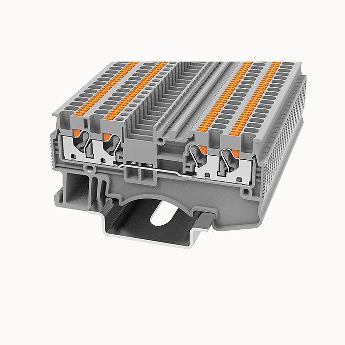 Клемма проходная пружинная Push-in, Кол-во точек подключения: 4, Сечение: 0,14 кв. мм - 1,5 кв. мм, Ном. Ток: 17.5А, Ширина: 3.5 мм, Цвет: серый, Тип монтажа: NS 35