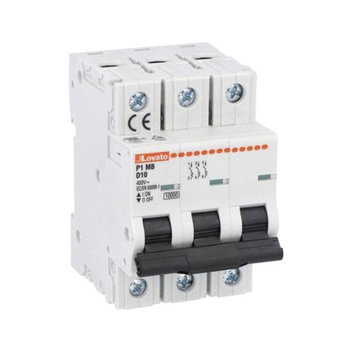 Модульный автоматический выключатель, 10А, кривая отключения D, 2p (два полюса), отключающая способность 10 кА. Производитель - Lovato Electric, серия P1M.
