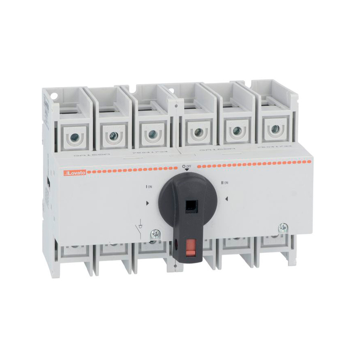 Реверсивный рубильник (I - 0 - II); 4 полюса, 630А, монтаж на плату, без удлинительной оси и рукояти. Производитель - Lovato Electric, серия GE