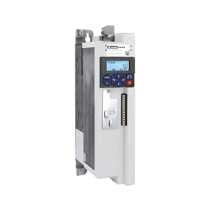 Преобразователь частоты, вход - одна фаза 230V, выход - три фазы 240В, мощность 1,5 кВт, номинальный выходной ток 7 А, встроенный ЭМС фильтр категории C2. Производитель - Lovato Electric, серия VLA.
