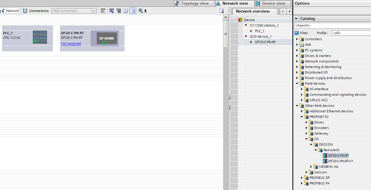 Переходим в Network view и в каталоге устройств Profinet IO выбираем DF20-C-PN-RT |