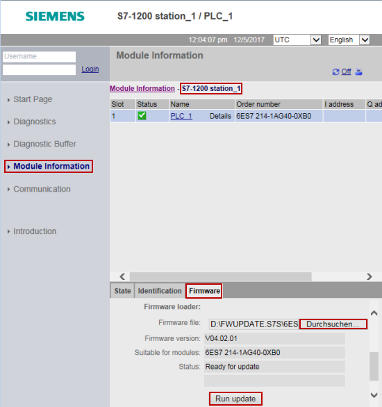 S7-1500 возможно обновить прошивку через интегрированный web-сервер. Для выполнения обновления прошивки, Вы должны сконфигурировать CPU в STEP 7 (TIA Portal) следующим образом: