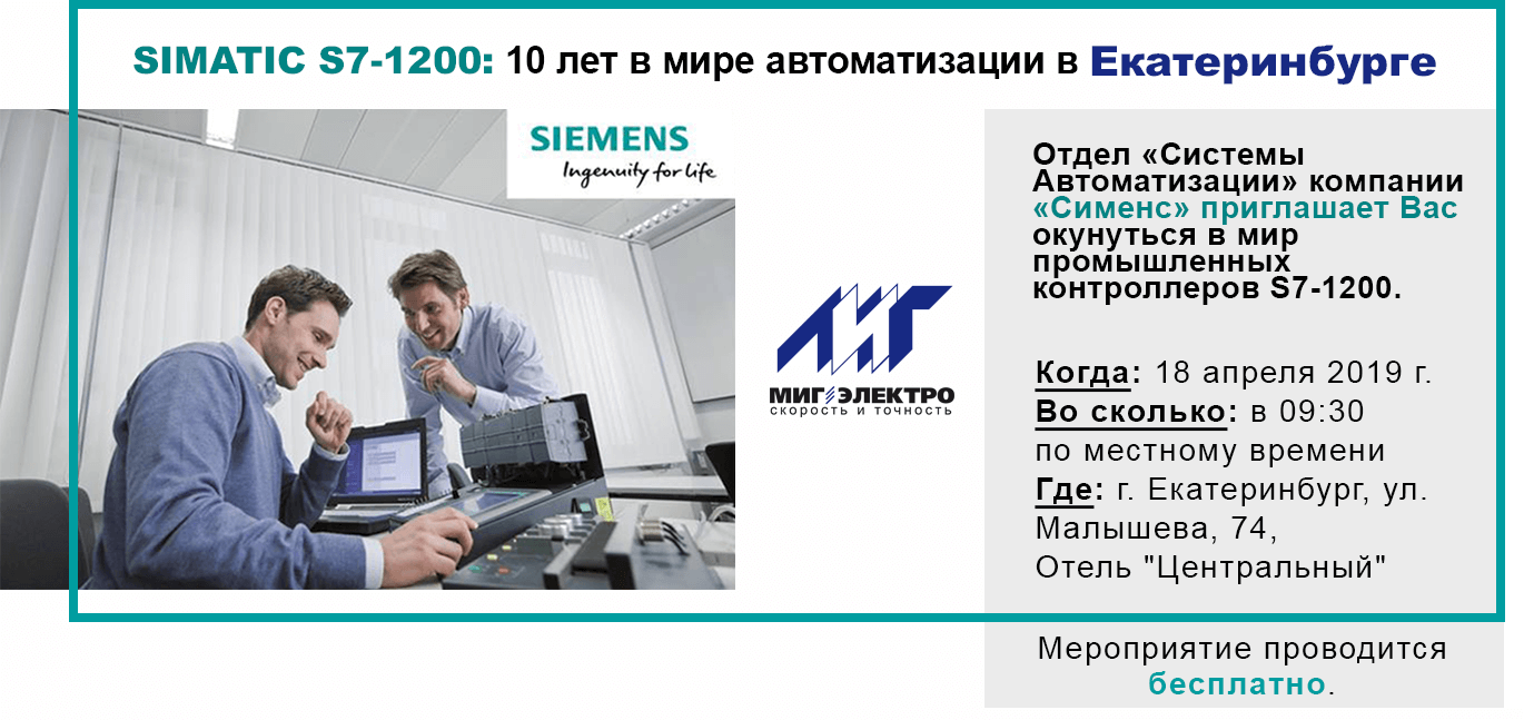 Уважаемый заказчик, отдел «Системы Автоматизации» компании «Сименс» приглашает Вас окунуться в мир промышленных контроллеров S7-1200, который пройдёт в Екатеринбурге.