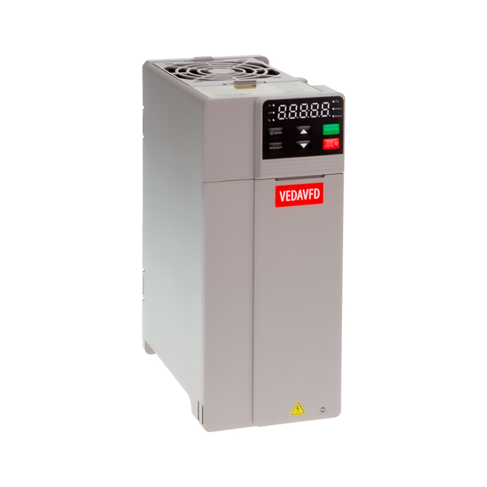 Преобразователь частоты VEDA VF-11, стандартная перегрузка, 3х380 В, выходная мощность 7,5 кВт, номинальный выходной ток 17 А, исполнение корпуса IP20, ЭМС фильтр встроен, тормозной ключ встроен, панель управления встроена, сетевой протокол RS-485