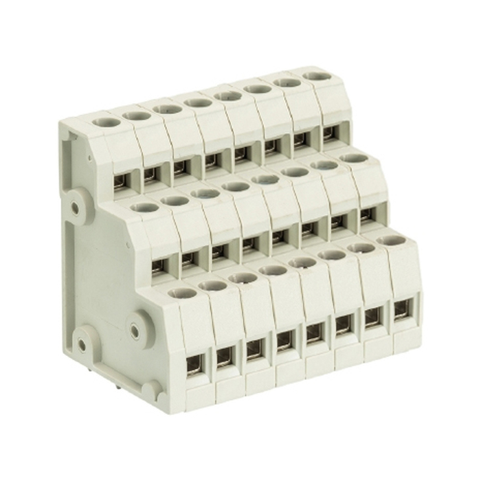 Клемма, 3 этажа, горизонтальный подвод кабеля, на плату, шаг: 5.0 мм, 24 полюса, фиксация провода винтовая, исполнение: без маркировки, 300V, 10A, цвет: серый