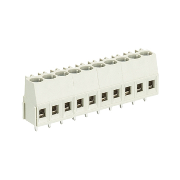 Клемма, горизонтальный подвод кабеля, на плату, шаг: 3.81 мм, 10 полюсов, фиксация провода винтовая, исполнение: без маркировки, 300V, 10A, цвет: серый