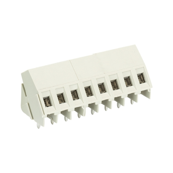Клемма, подвод кабеля 35 град., на плату, шаг: 5.0 мм, 8 полюсов, фиксация провода винтовая, исполнение: без маркировки, 300V, 16А, цвет: серый