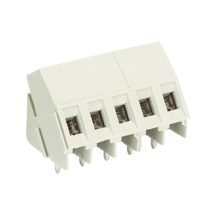 Клемма, подвод кабеля 35 град., на плату, шаг: 5.08 мм, 5 полюсов, фиксация провода винтовая, исполнение: без маркировки, 300V, 16А, цвет: серый
