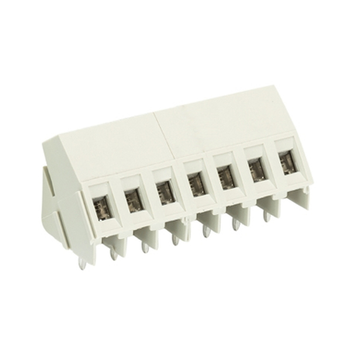 Клемма, подвод кабеля 35 град., на плату, шаг: 5.08 мм, 7 полюсов, фиксация провода винтовая, исполнение: без маркировки, 300V, 16А, цвет: серый