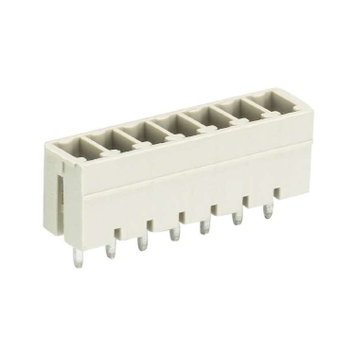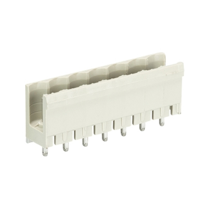 Вилочный разъем, вертикальный, на плату, шаг: 5.0 мм, 7 полюсов, фиксация на плате пайкой, исполнение: без маркировки, без боковых стенок, 400V, 12А, цвет: серый