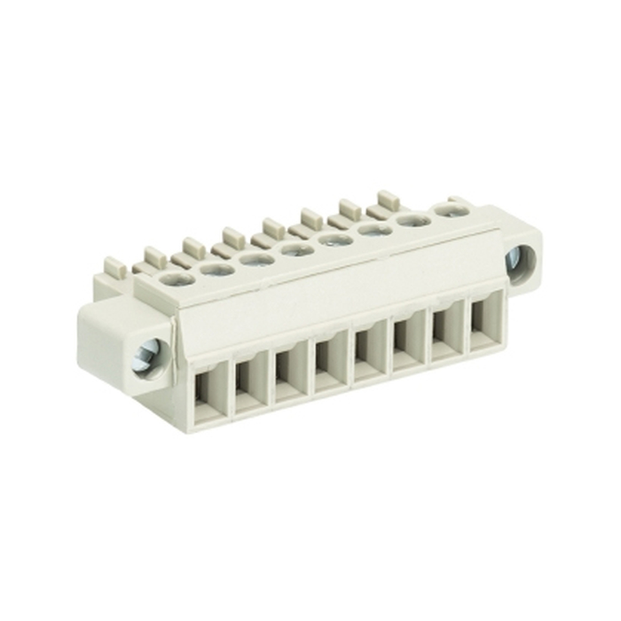 Розеточный разъем, угловой, на кабель, шаг: 3.81 мм, 8 полюсов, фиксация провода винтовая, исполнение: без маркировки, с монтажными фланцами, 250V, 8А, цвет: серый
