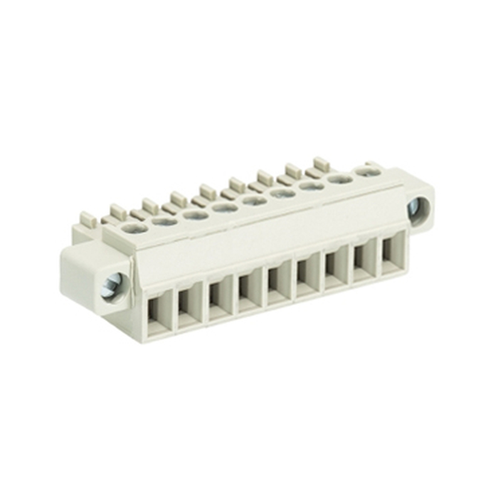 Розеточный разъем, угловой, на кабель, шаг: 3.5 мм, 9 полюсов, фиксация провода винтовая, исполнение: без маркировки, с монтажными фланцами, 250V, 8А, цвет: серый