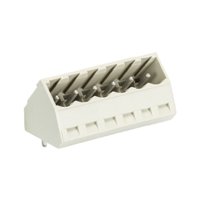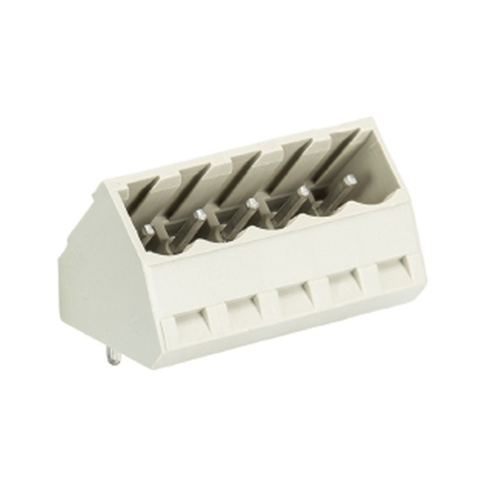 Вилочный разъем, угол 45 градусов, на плату, шаг: 5.0 мм, 6 полюсов, фиксация на плате пайкой, исполнение: без маркировки, 400V, 12А, цвет: серый