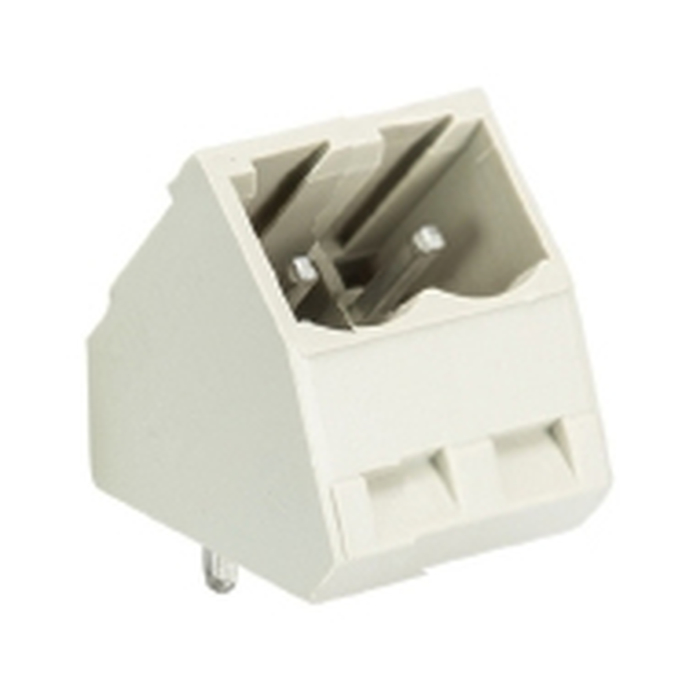 Вилочный разъем, угол 45 градусов, на плату, шаг: 5.0 мм, 3 полюса, фиксация на плате пайкой, исполнение: без маркировки, 400V, 12А, цвет: серый