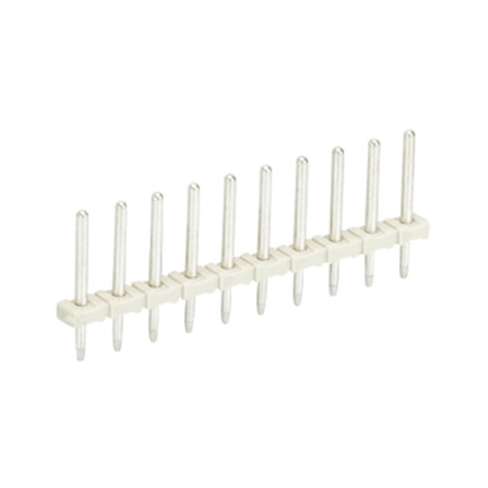 Штыревой контакт, вертикальный, на плату, диаметр штыря 0,8 мм, шаг 3,5 мм, 10 полюсов, фиксация на плате пайкой, 250V, 6А, цвет: серый, серия 8543