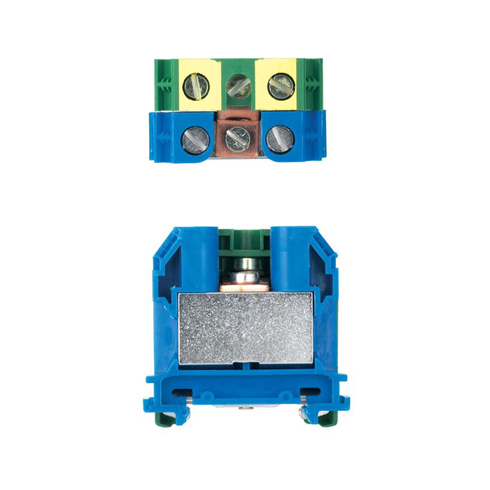 Клеммная сборка из 2 клемм: 9700A/16 PE, 9700A/16 N, тип фиксации провода: винтовой, номинальное сечение: 35 мм кв., 125A, 800V, цвет: синий/желто-зеленый, тип монтажа: DIN35
